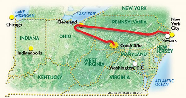 TRACKING UNITED FLIGHT 93: United Flight 93 was delayed, but took off from Newark International Airport at 8:42 a.m., Sept. 11, 2001, just minutes before the first hijacked plane hit the North Tower of the World Trade Center in New York. It was to have been a non-stop flight to San Francisco. Aboard were 33 passengers, seven crew members and four Islamic terrorists. The flight was nearing the Ohio state line, beginning to be tracked by air traffic controllers in Indianapolis, when it was taken over by the terrorists around 9:30 a.m. It made a U-turn near Cleveland and headed southeast toward Washington, D.C. Passengers are credited with trying to overtake the terrorists who crashed the plane near Shanksville, Pennsylvania, at 10:03, 20 minutes away from Washington.