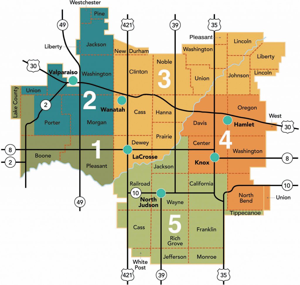 District 4 includes Davis, Center, Oregon, Washington, and North Bend townships in Starke County, and Union and West townships in Marshall County.