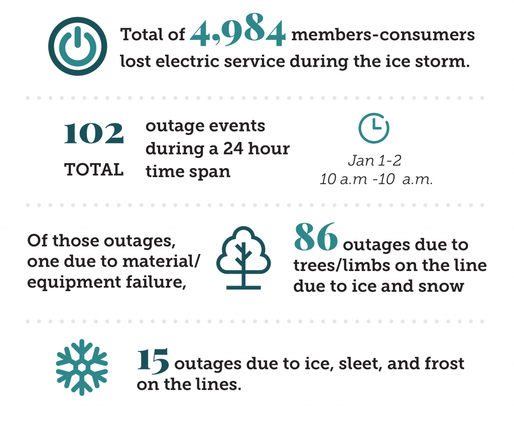 Just hours into the new year, the KV REMC service territory was canvased by an ice storm. A messy mix of wind, ice and snow left 4,984 member-consumers in the dark.