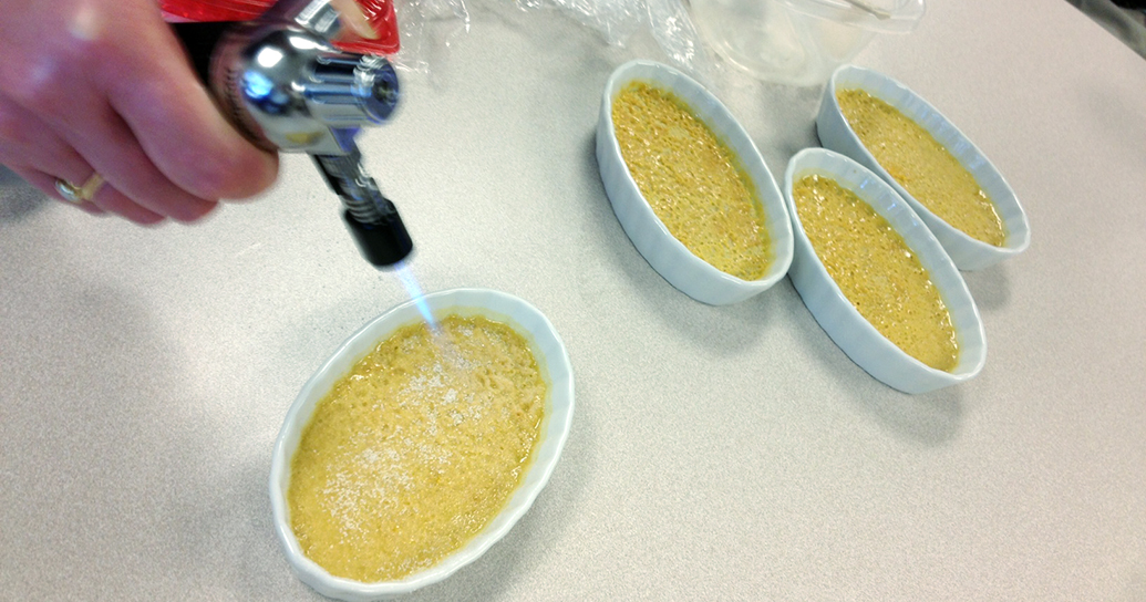 Just before serving time, sprinkle about 1/2-1 t. of sugar over each custard. Using a kitchen torch, melt and carmelize the sugar. Or, place the ramekins in a baking dish and put under broiler for 1 to 2 minutes, just until browned and carmelized. Serves 8-10.
