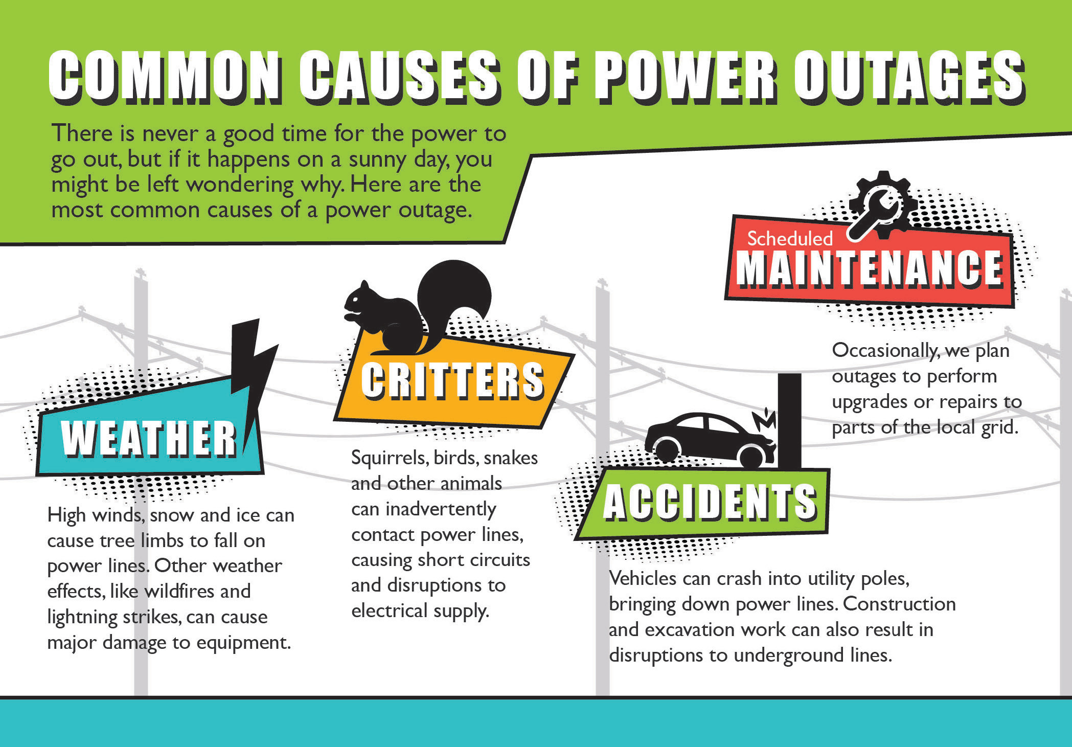 - Sometimes it’s a waiting game. Our portion of the power grid is connected to other electric utilities, and we maintain positive relationships with power providers interconnected to our system. If our outage is due to an issue from their feed into our system, we must let them do their repairs and be mindful of what they’re going through to fix it.