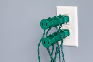 Electrical outlet overloaded with Christmas string lights. Holiday decoration safety, hazards and fire prevention concept. By hhuffman Posted on Dec 02 2024 in