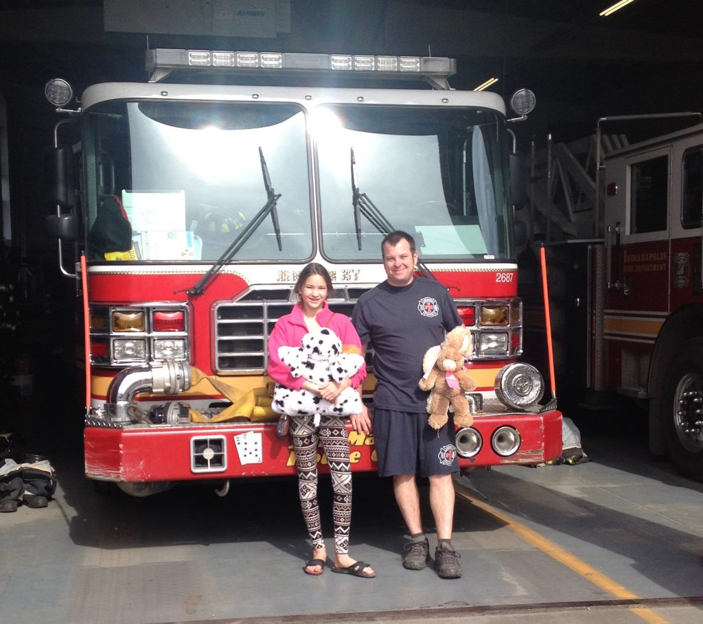 2017 Youth Power and Hope Award winner Sarah Kouns donates stuffed animals to the Indianapolis Fire Department for children involved in fires.