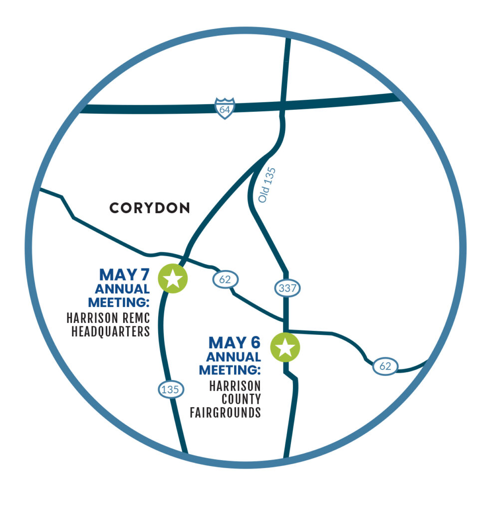 The Harrison REMC Annual Meeting will be held Wednesday, May 6, from 4 to 6:30 p.m. at the Harrison County Fairgrounds and Thursday, May 7, from 11:30 a.m. to 6:30 p.m. at the Harrison REMC headquarters in Corydon.