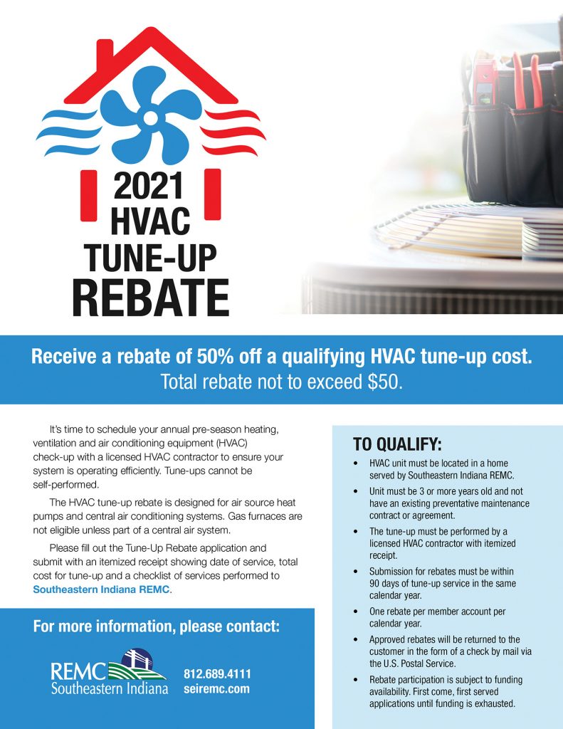 HVAC Tune-Up Rebate By Indiana Connection Posted on Apr 06 2021 in Southeastern Indiana REMC Related Stories Advancing amid challenges Celebrating National Co-op Month UNDERSTANDING THE RATE ADJUSTMENT