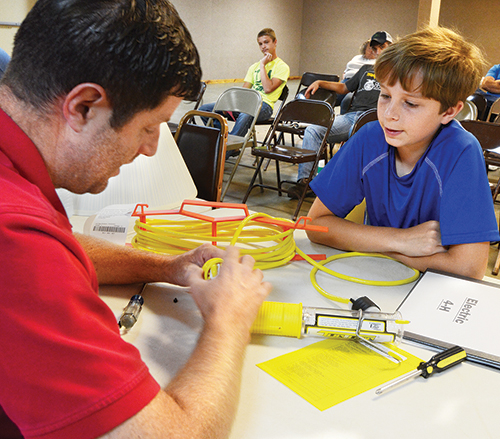 Brayden Byers, front, reviews the mechanics of his switch project with judge Rachel Olsen, marketing and communication manager at Heartland REMC. All down the table, various aged 4-H’ers go over their projects with judges.