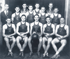 Luann Moberg, left, pays homage to her dad, Jack L. Miller, number 3 in the 1939 team photo, by posing in his Monument City High School varsity letterman’s sweater while taking the tour. Moberg grew up in nearby Wabash. Her dad died in 2009.