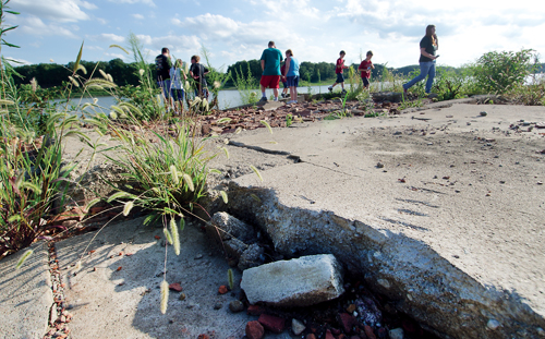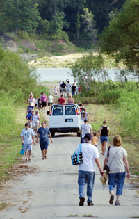 As if on a pilgrimage, visitors make their way to and from what once was Monument City on the edge of the Salamonie reservoir Aug. 5. Though exposed in winter, the old town site and this portion of road are usually under water in summer. The Indiana Department of Natural Resources hosted two Sunday evening “homecomings” at the site in response to public interest after it became exposed by the drought-lowered lake.