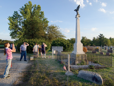 At the close of the second Sunday of evening tours to the old Monument City site on the Salamonie Lake shoreline, Darla Williams of Bryan, Ohio, takes a photo of the town’s namesake. The monument, erected in 1869, remembers 27 soldiers from Huntington County’s Polk Township who died in the Civil War. It, along with the town’s graves, were moved to a new cemetery a mile north of the town when the reservoir was created in the mid-1960s.