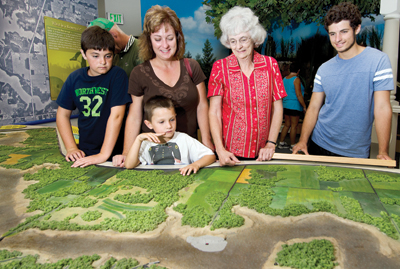 The Salamonie Interpretive Center offers a 3D map of the reservoir. Looking over the Monument City site (the gray area with the red light) is Nancy Smith who was married in Monument City 58 years ago. With her are her daughter, Anita Hughes, and grandsons, from left, Maxwell, Jackson and Alex.