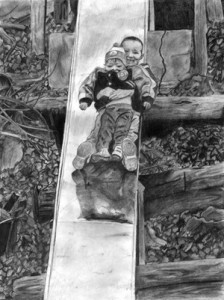 The drawing was based on a photo made by Kenny’s father some years ago of Kenny and his little sister on a sliding board at a Wabash city park. For the illustration, Kenny “weatherized” the photo. He said once he added fallen leaves and twigs, “Then it became October.”