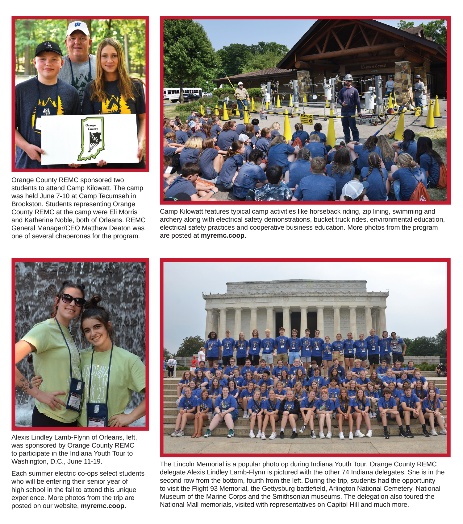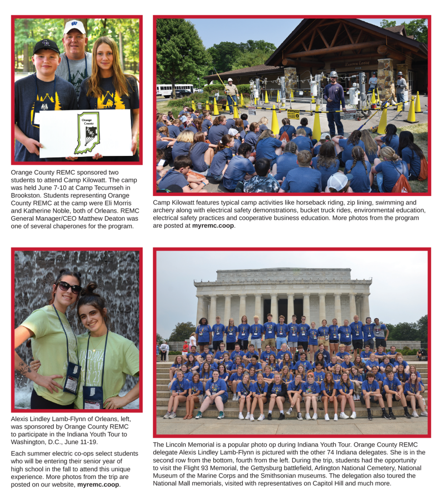 A summer to remember Local Students Attend Camp Kilowatt and Indiana Youth Tour By Indiana Connection Posted on Aug 13 2023 in Orange County REMC Related Stories A season of gratitude and community 2025 Member Appreciation Day Join us for a Christmas toy drive