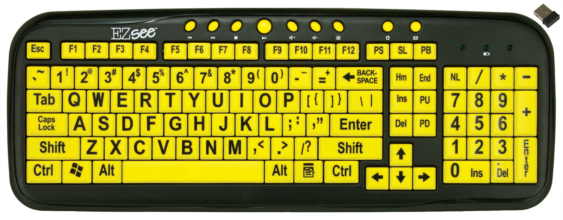 Those who struggle to see the keys on a conventional computer keyboard will find typing easier on the Ergoguys CD-1038 Ezsee Large-Print Low-Vision Keyboard. The extra-large keys are bright yellow with bold black lettering for easy viewing. It sets up quickly with a USB connection and works well in low-light environments. $31.