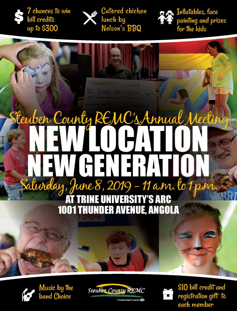 Annual Meeting Is June 8! New Location, New Generation Is Meeting's Theme By Indiana Connection Posted on Apr 29 2019 in Steuben County REMC Related Stories Want to serve your community? Broadband internet for your home and business from Steuben County REMC Calendar