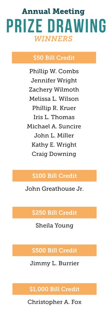 Annual Meeting Prize Winners Find out who won prizes at the clark county remc annual meeting By Indiana Connection Posted on May 06 2020 in Clark County REMC Related Stories Hoosier Energy advances pollinator habitat conservation efforts Providing reliable service while staying financially strong Donate to our food drive