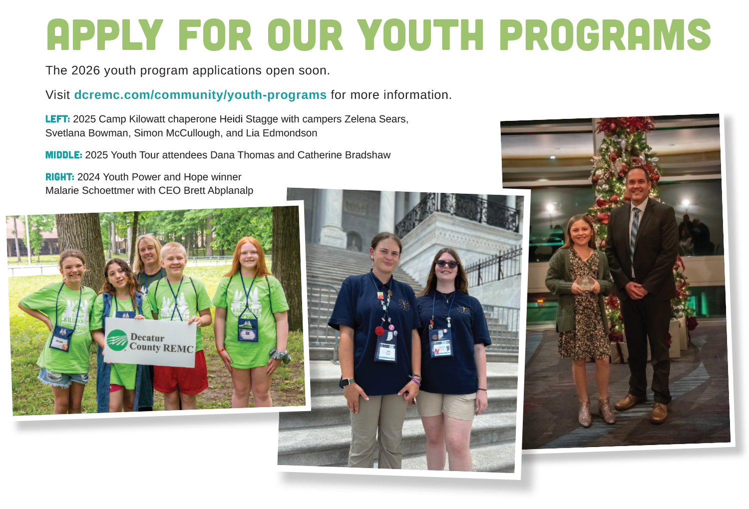 Local youth can apply for these programs By Indiana Connection Posted on Nov 04 2025 in Decatur County REMC Related Stories Unclaimed capital credits Powering progress Join us for Cocoa and Cookies on Dec. 16
