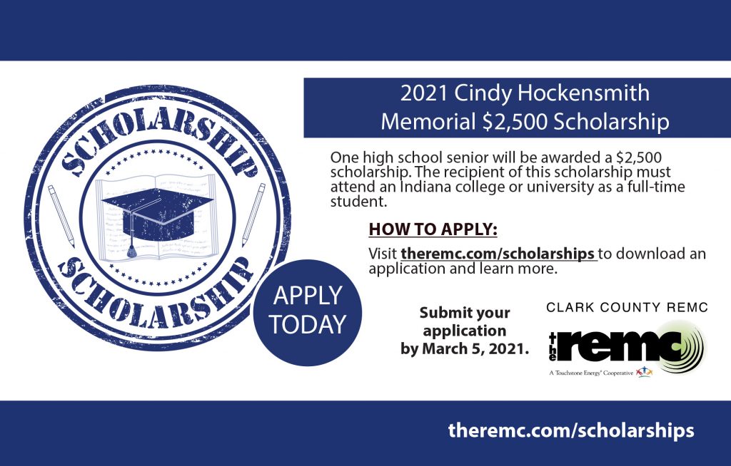 Apply for the Cindy Hockensmith scholarship By Indiana Connection Posted on Jan 30 2021 in Clark County REMC Related Stories Hoosier Energy advances pollinator habitat conservation efforts Providing reliable service while staying financially strong Donate to our food drive