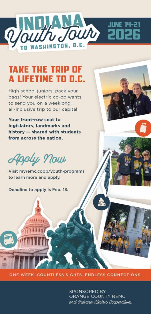 Apply now for the Indiana Youth Tour 2026! By Indiana Connection Posted on Jan 02 2026 in Orange County REMC Related Stories Working together to lower demand 2026 timeline for REMC director election Get ready for summer at Camp Kilowatt