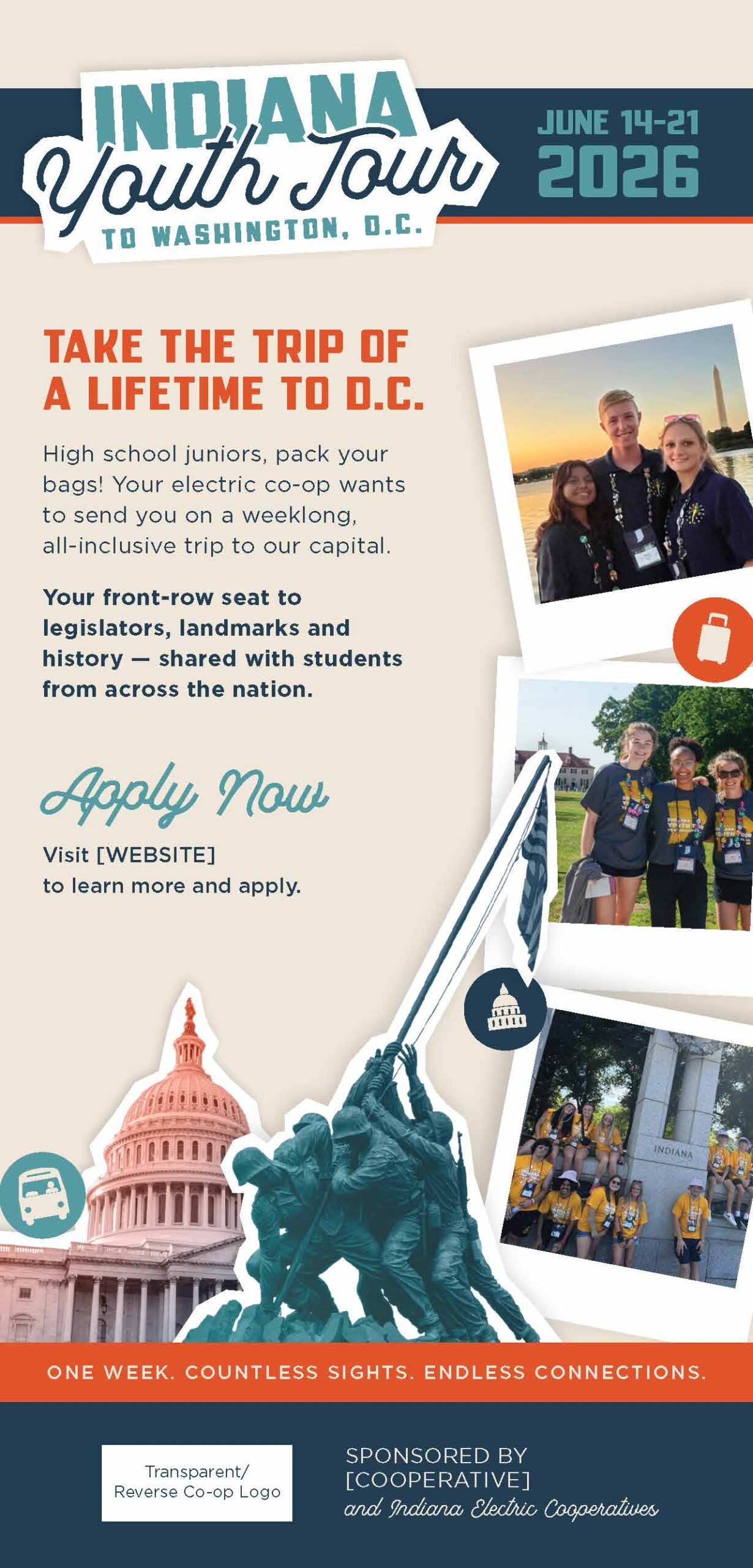 Apply now for the Indiana Youth Tour 2026! By hhuffman Posted on Dec 04 2025 in Orange County REMC Related Stories Apply today for 2026 Page Day Seeking artwork for Cooperative Calendar Contest Hoosier Energy advances pollinator habitat conservation efforts