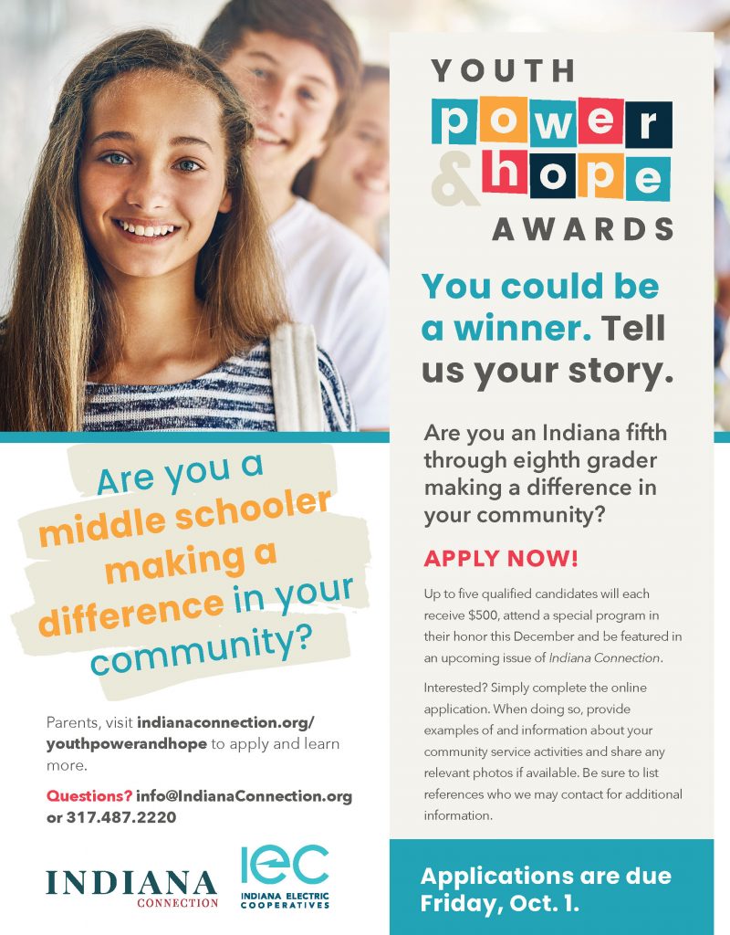 Apply now for the Youth Power and Hope Awards By Indiana Connection Posted on Aug 01 2021 in Steuben County REMC Related Stories Want to serve your community? Broadband internet for your home and business from Steuben County REMC Calendar