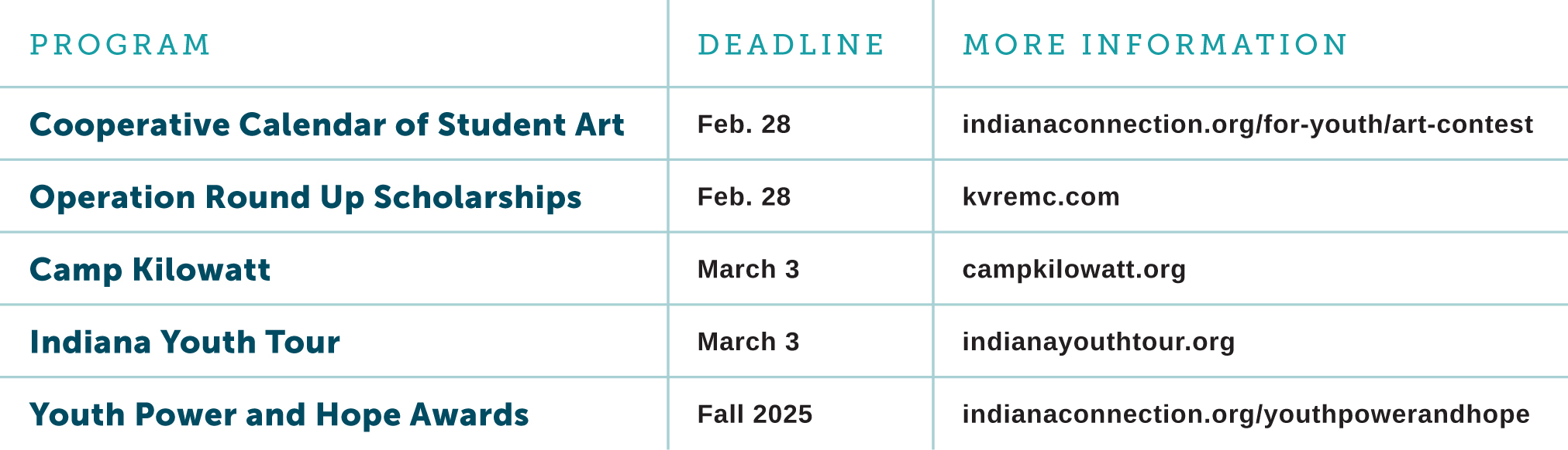 Two $2,000 and four $1,000 scholarships are awarded annually to high school graduating students whose parents or guardians are KV REMC member-consumers. Students must graduate in 2025 and plan to attend a college, university, or technical school in the fall of 2025. Parents or guardians must be Operation Round Up participants by Jan. 28 for the student to be eligible to apply.