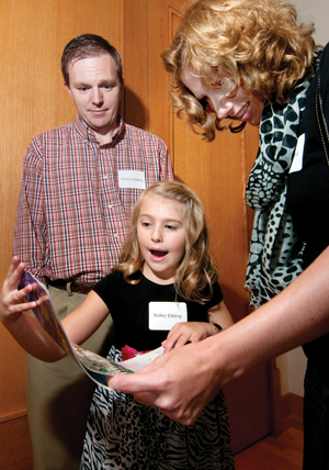 Bailey Ebbing, the cover artist of the 2012 calendar, reacts with pleasant surprise at another winning work inside the calendar. With her are her parents, Thomas and Bobbi Ebbing. Bailey, now a first grader, attends St. Mary’s School in Greensburg.