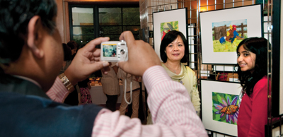 Zuha Ali, right, and her art instructor, Chi-jen Fang, pose beside Zuha’s honorable mention-winning work (top) during a reception hosted by the Hoosier Salon for the cooperative calendar student artists at the Indiana Governor’s Residence in September. Zuha created the work of a rooster tending a brood of rambunctious chicks for Father’s Day as a sixth grader. Fang, who instructed four of the winners, teaches art at her studio in West Lafayette. Taking the picture is Zuha’s dad, Muhammad Ali.