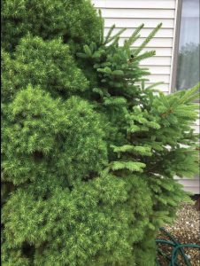 A: This is a great photo. What’s happening to your trees is not really a rare occurrence. You are indeed on the right track. These are dwarf cultivars that are reverting back to what is the normal growth for the species.