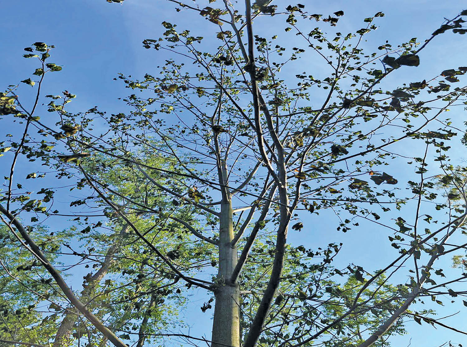 Wow, that’s quite a bit of damage. I can’t tell anything specific from the images you sent, but I wonder if there is more than one problem at work here? Is the tree starting to show any signs of regrowth? I suggest you submit a sample to the Purdue Plant and Pest Diagnostic Lab at ag.purdue.edu/department/btny/ppdl to get a proper diagnosis. You can start with digital images, and they will advise if they want you to follow up