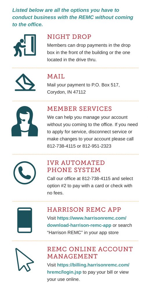 Bill payment options By Indiana Connection Posted on Jul 24 2020 in Harrison REMC Related Stories A season of gratitude and community Holiday hours 2025 Time of day hours