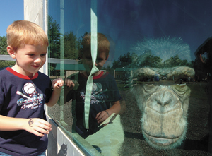 Aidan Dreibelbis of Albion gets a close up look at Tarzan the chimpanzee through a tinted window at Black Pine Animal Park, a retirement and rescue center for exotic animals.