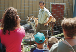 Mikel Peña leads a group of visitors at Black Pine past one of the tiger enclosures. Peña, a high school graduate from nearby Ligonier, is interning at the park this summer on a diversity grant to translate and help make the park’s messages and outreach more inviting to the Hispanic community in the area.