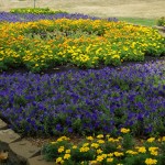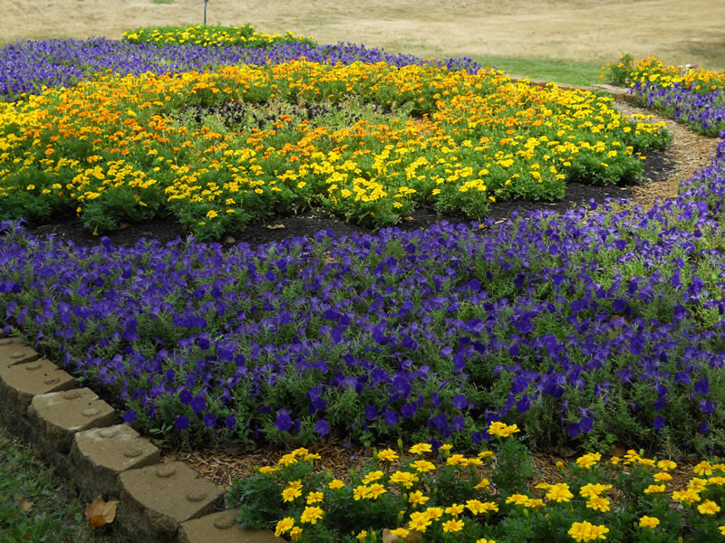 There’s a vast array of garden flowers that can fit in the blue-and-gold theme. Some “blue” flowers are more purple than blue and, likewise, some “gold” flowers are more yellow. Most annual flowers will bloom throughout the growing season.
