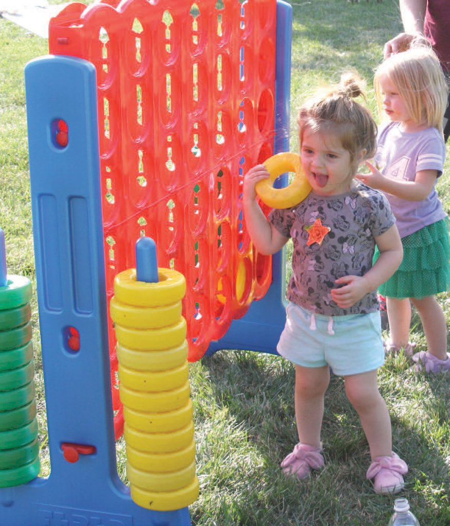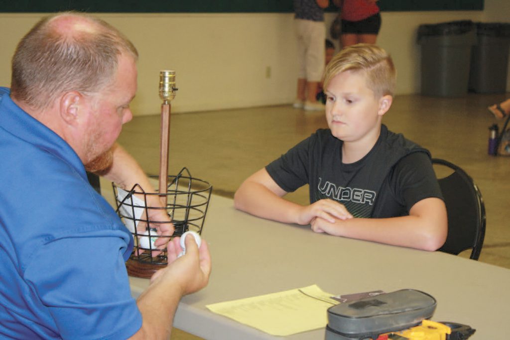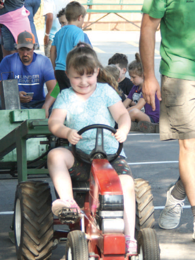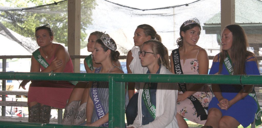 A HOLE IN ONE: The reserve champion for electricity Parker Lawson of Lebanon waits for his golf lamp to be judged. Grand champion went to James Holbrook of Zionsville who made a Tesla coil. ENJOYING THE WORK: Little Miss Boone Aubrey Culley also won the tractor pull on family night. LET’S TALK CO-OP: Board Member Jon Stevens chats with member Alan Lyon of Sheridan. Stevens represents the 5th district, which covers Center Township. Several directors helped at the booth. WILLIE WIREDHAND FANS: These young Boone County 4-H Fair goers stopped by the Boone REMC booth to pick up stickers for their shirts. The co-op had a booth from Saturday to Sunday this year. THE QUEEN AND HER COURT: Newly crowned Miss Boone County Riley Lamb (second from right) and her court sit in attendance at the steer judging. Miss Indiana State 4-H Queen Halle Shoults (front row at left) was also in attendance on Monday night. FAMILY NIGHT FUN: These toddlers, Harper and Haley Wilhoite, couldn’t reach the top of the Connect Four game on family night, but it did not stop their fun. There were several games around the circle, including bowling and life-size Jenga. PARADE OF CHAMPIONS: Showing off his award winning pony, this champion stands in the parade of champions during Monday night’s events.