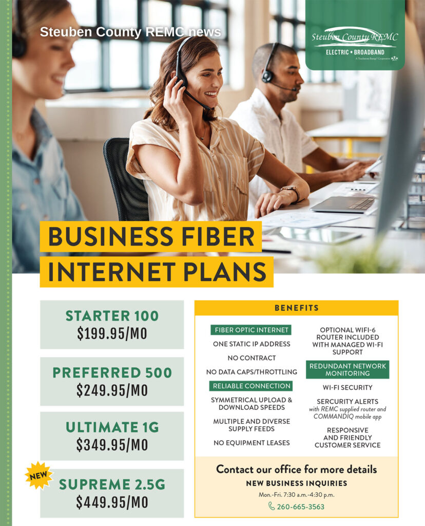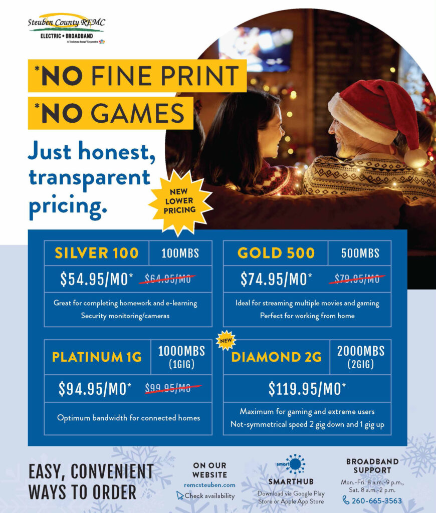Broadband internet for your home and business from Steuben County REMC By Indiana Connection Posted on Dec 05 2025 in Steuben County REMC Related Stories Want to serve your community? Calendar Christmas tree recycling