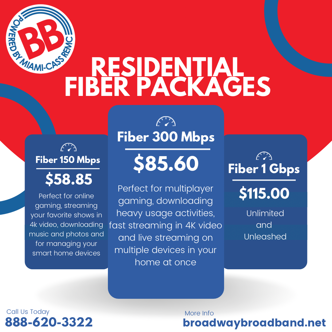 Broadway Broadband’s Residential Fiber Packages By hhuffman Posted on Jul 07 2023 in Miami-Cass REMC Related Stories Reflecting on 2025, building for 2026 Annual meeting recap Holiday food prep ingredients for safety