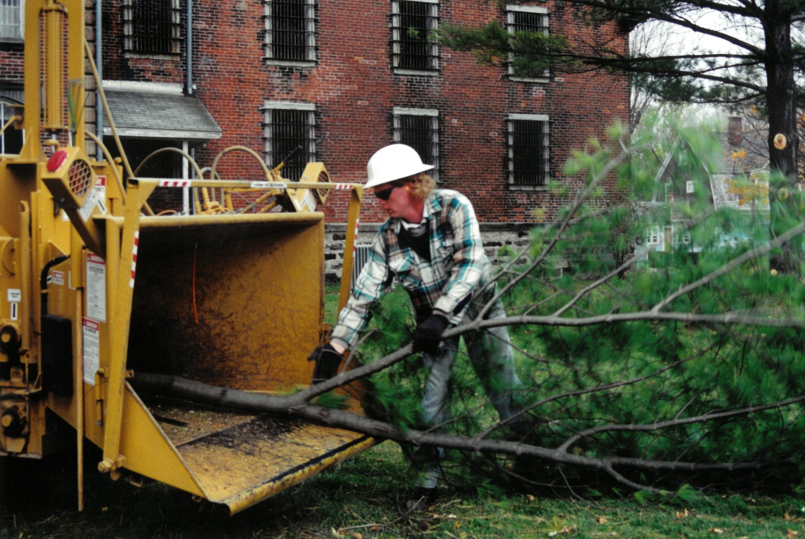 Burns in 1999, during his first year as a Noble REMC tree trimmer, throwing a limb into a chipper.