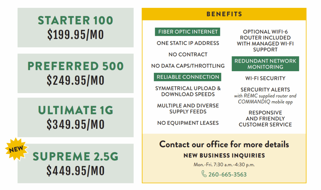Business fiber internet plans By Indiana Connection Posted on Jun 13 2025 in Steuben County REMC Related Stories Want to serve your community? Broadband internet for your home and business from Steuben County REMC Calendar