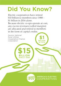 Capital credits are just one benefit of your membership in an electric cooperative. As a not-for-profit, whenever the cooperative has margins that exceed operating expenses, those margins are returned to the membership receiving service in those years. Instead of the traditional business model in which stockholders and corporate bigwigs benefit from business profits, it is you, the member-owner, who benefits from being a part of our business. We are proud to be able to return these funds to our dedicated members.