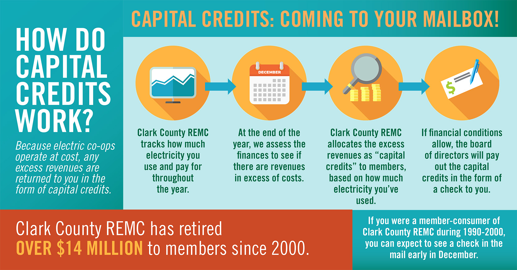 Under the cooperative business model, earnings are calculated at the end of the year. Anything left over after operating costs, loan payments and other expenses, is called a margin. Over time, these margins are retired, or paid back, to every member that has received electricity from Clark County REMC. This is known as a capital credit.