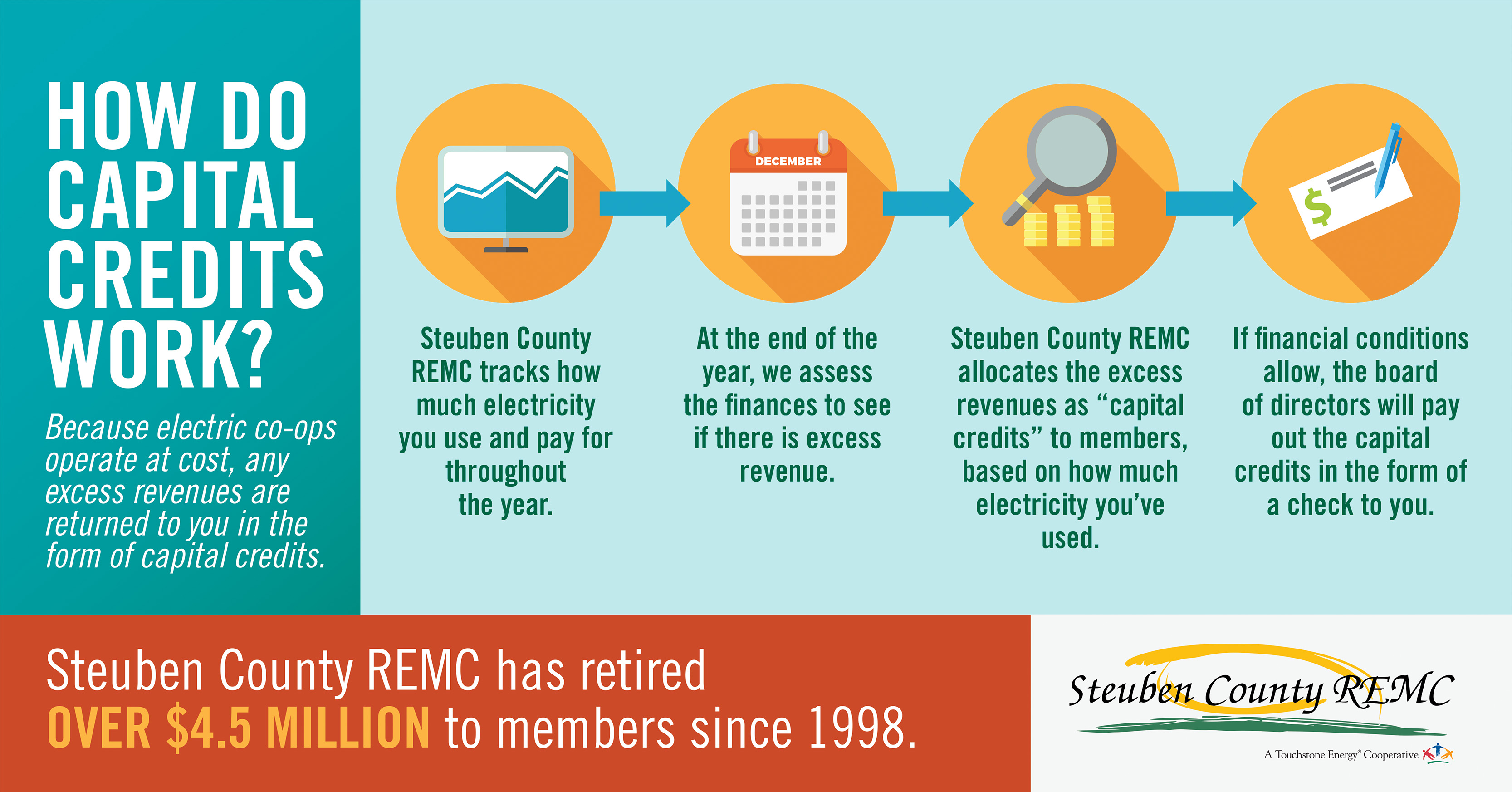 Capital credits are just one benefit of your membership in an electric cooperative. As a not-for-profit, whenever the cooperative has margins that exceed operating expenses, those margins are returned to the membership receiving service in those years. Instead of the traditional business model in which stockholders and corporate big-wigs benefit from business profits, it is you, the member-owner, that benefits from being a part of our business. We are proud to be able to return these funds to our dedicated members.