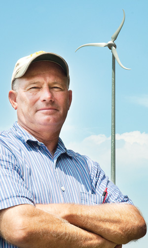 Bartholomew County REMC consumer Jay Shoaf stands by his backyard wind turbine — in more ways than one. Though the Hope grain farmer knew the residential-sized turbine would hardly make a dent in his energy use, he says he’s glad he has it and is doing something in terms of self-reliance and energy independence. Photo by Richard G. Biever