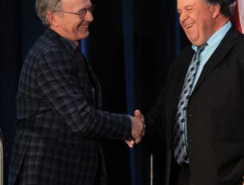 Dr. Richard Leeper, left, was recognized at the Indiana Electric Cooperatives’ Annual Meeting in December for his service to the cooperative. Leeper has served on the Marshall County REMC board of directors for 25 years. Outgoing Indiana Electric Cooperatives President Walter Hunter, right, congratulates Leeper on his achievement.