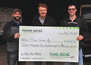 Prime Care Ag of Wawaka recently received a $12,408.80 POWER MOVES® rebate for LED lighting installed at a new farrowing facility west of Kendallville on U.S. 6. Noble REMC Energy Advisor Brian Hawk, left, presents the check to Prime Care Ag representatives Mitch Wysong, center, and Chuck Wysong, right.