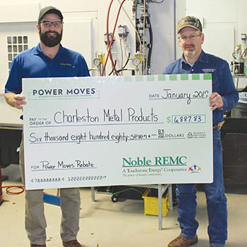 Charleston Metal Products of Corunna recently received a Noble REMC POWER MOVESĀ® rebate check for improving the energy efficiency of the business. It earned $6,887.83 for the installation of a variable-frequency drive air compressor, an efficient way to save money and energy.