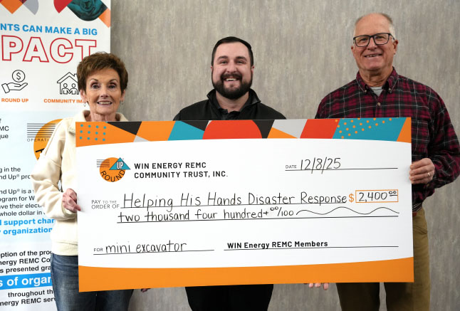Pictured, from left: Mary Ann Miller, WIN Energy REMC Community Trust chairman; Ryan Reedy, disaster response coordinator Shawn McDowell, WIN Energy REMC Community Trust board member