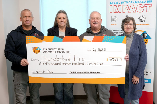 Pictured, from left: Chris Fry, fire chief; Deann Talley, WIN Energy REMC Community Trust vice chairman; Tim Schott, assistant chief; Leslie Stultz, WIN Energy REMC Community Trust board member