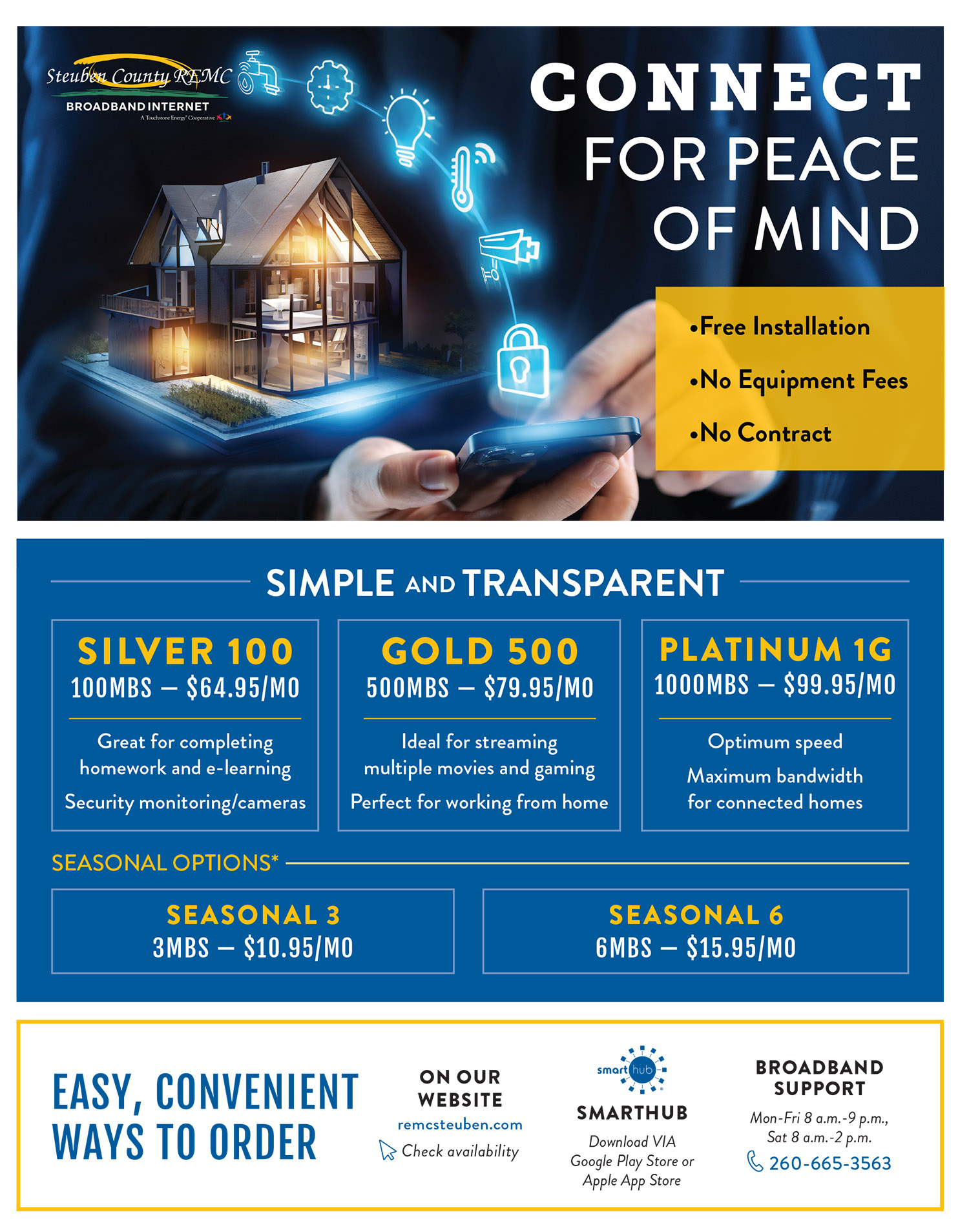 Connect for peace of mind By hhuffman Posted on Oct 16 2024 in Steuben County REMC Related Stories Want to serve your community? Broadband internet for your home and business from Steuben County REMC Calendar