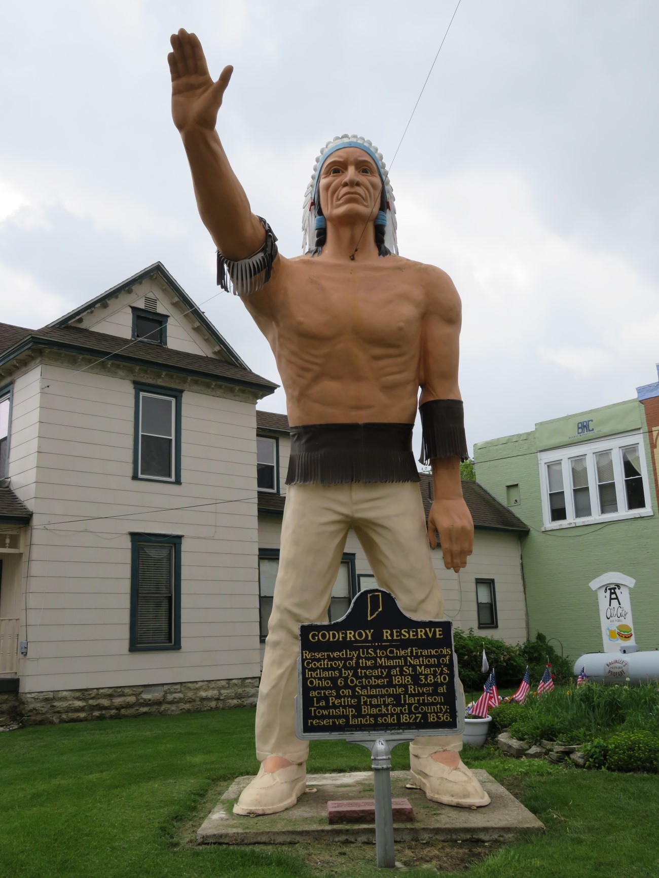 The “Miami Indian” is a 25-foot fiberglass statue in Montpelier, Indiana, known for its appearance in the opening credits of the TV show “Parks and Recreation.” The statue was first installed at a Pontiac dealership in Indianapolis. It was later moved to a Native American museum at Eagle Creek Park before Miami leader Larry Godfroy donated the statue to Montpelier in 1984. It now stands near the historic Godfroy Reserve, which is land granted by an 1818 treaty to Chief François Godfroy and his people. The reserve once covered nearly 4,000 acres along the Salamonie River in Blackford County before being sold in the 1820s and 1830s.