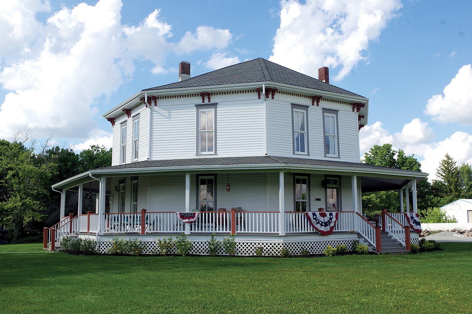 Built in 1879, the Jane Ross Reeves Octagon House is one of five octagon houses left in Indiana. Ross Reeves discovered the octagon house design in a magazine and had it built for roughly $2,500. The two-story, wood-frame house has 16 rooms and originally four chimneys. These were removed and rebuilt along with a full basement when the house was relocated in 1997 from Wilkinson, Indiana, to Shirley, Indiana. Visitors can request a tour of the 145-year-old house, renowned for its well-preserved condition.